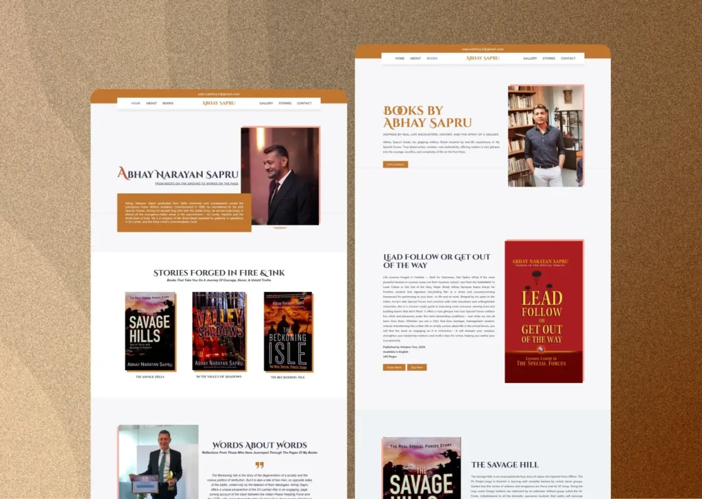 The author, Maj. Abhay Sapru, needed a personal website that showcased his published books, shared his thoughts, and provided readers with an easy way to explore, review, and purchase his works. The challenge was to create a platform that felt refined, credible, and storytelling-driven, reflecting the tone of a decorated military officer turned author.